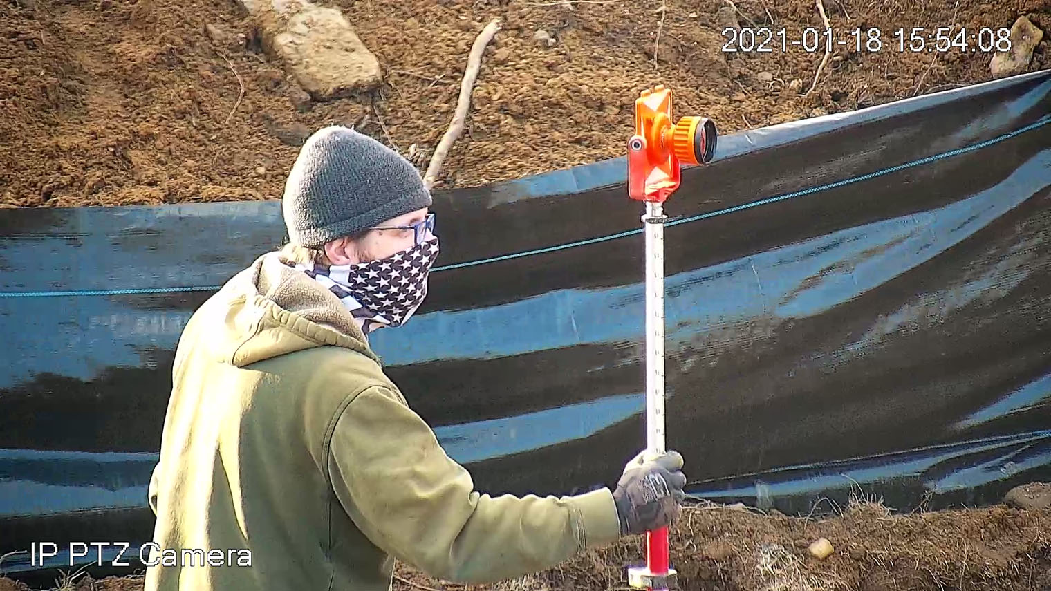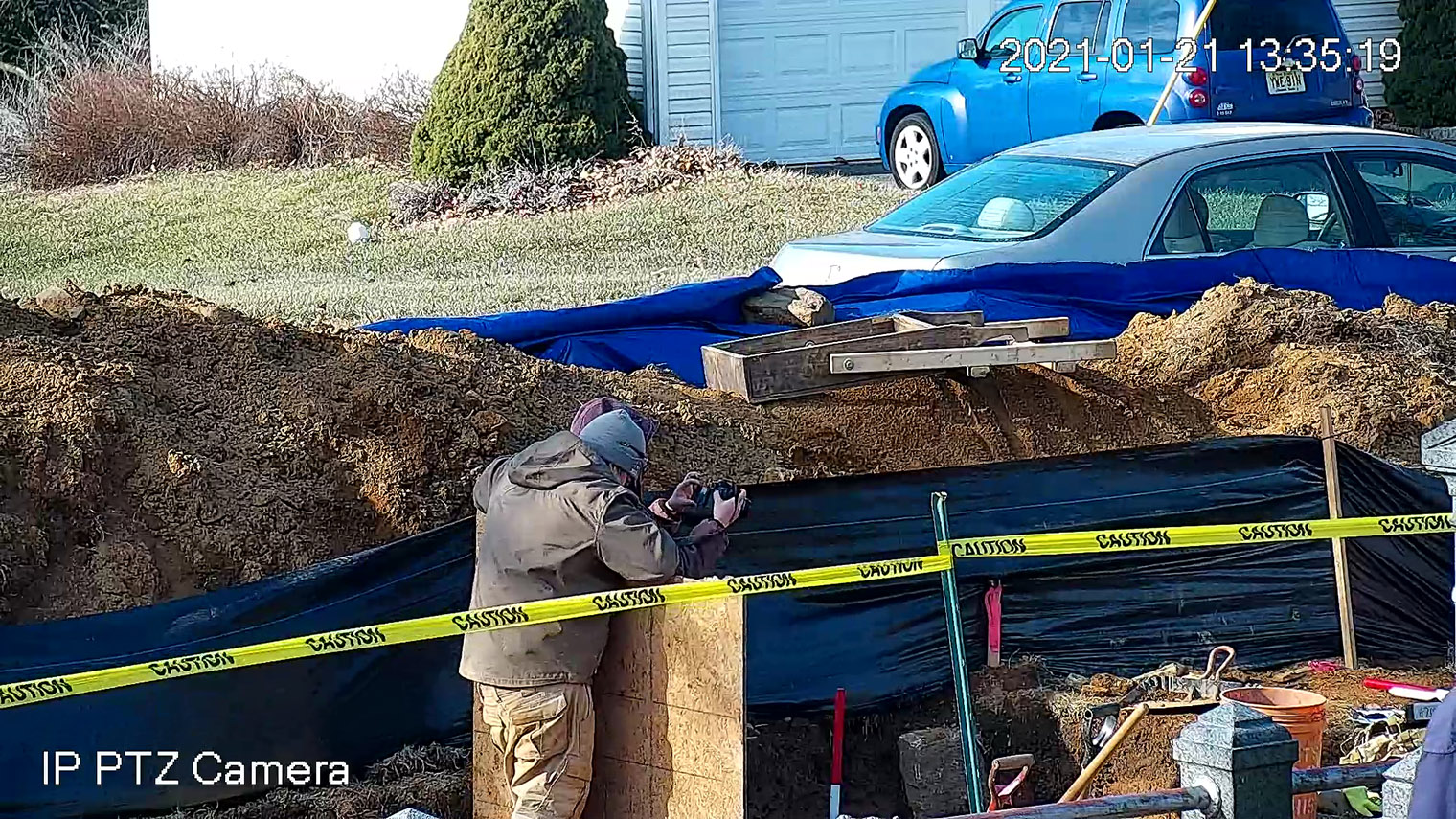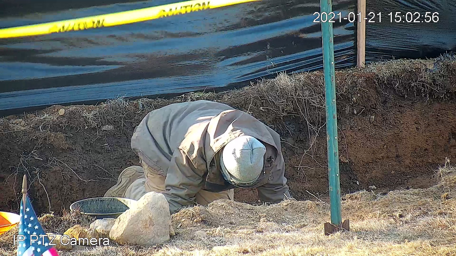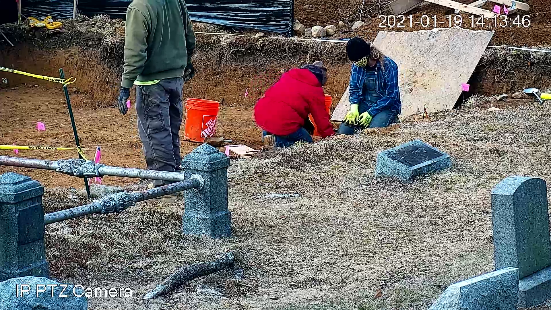 A new camera to monitor the Meeting House property was installed and connected online, allowing the work to be photographed remotely. By the end of the day, Trench #1 (T1) was opened and prepared for closer inspection.