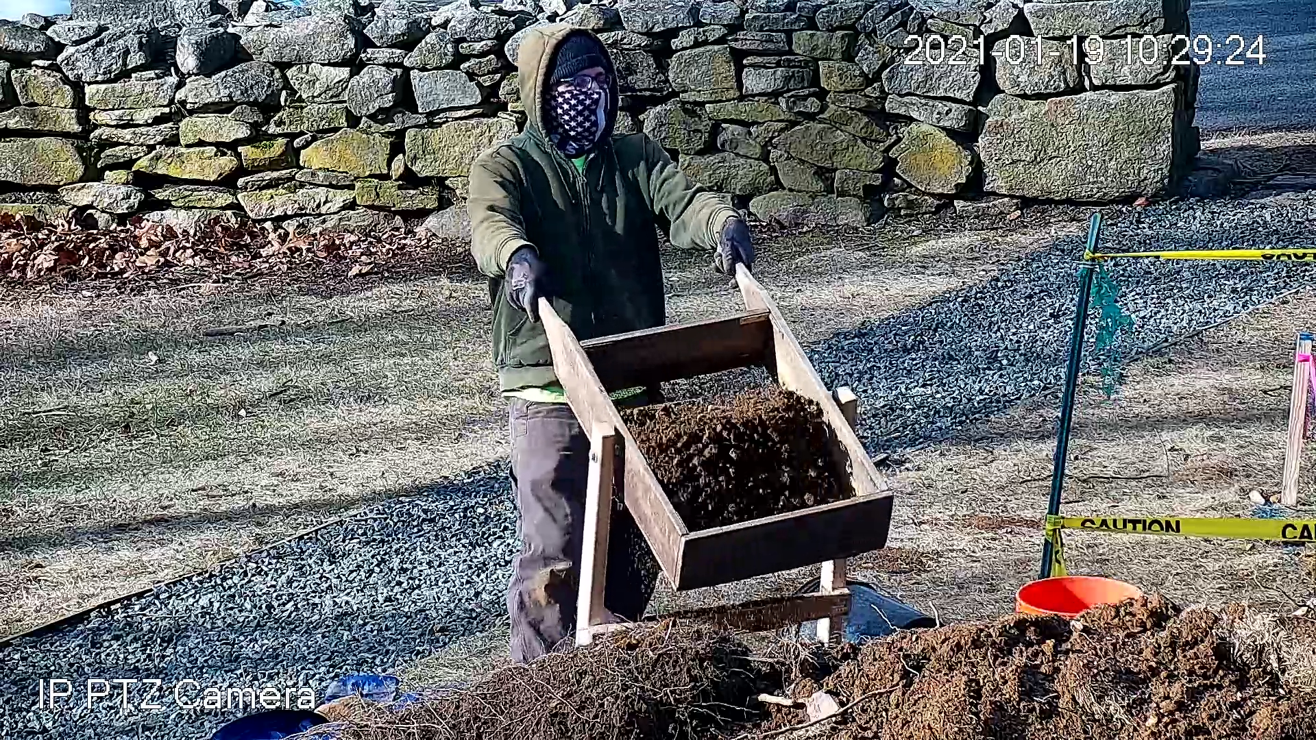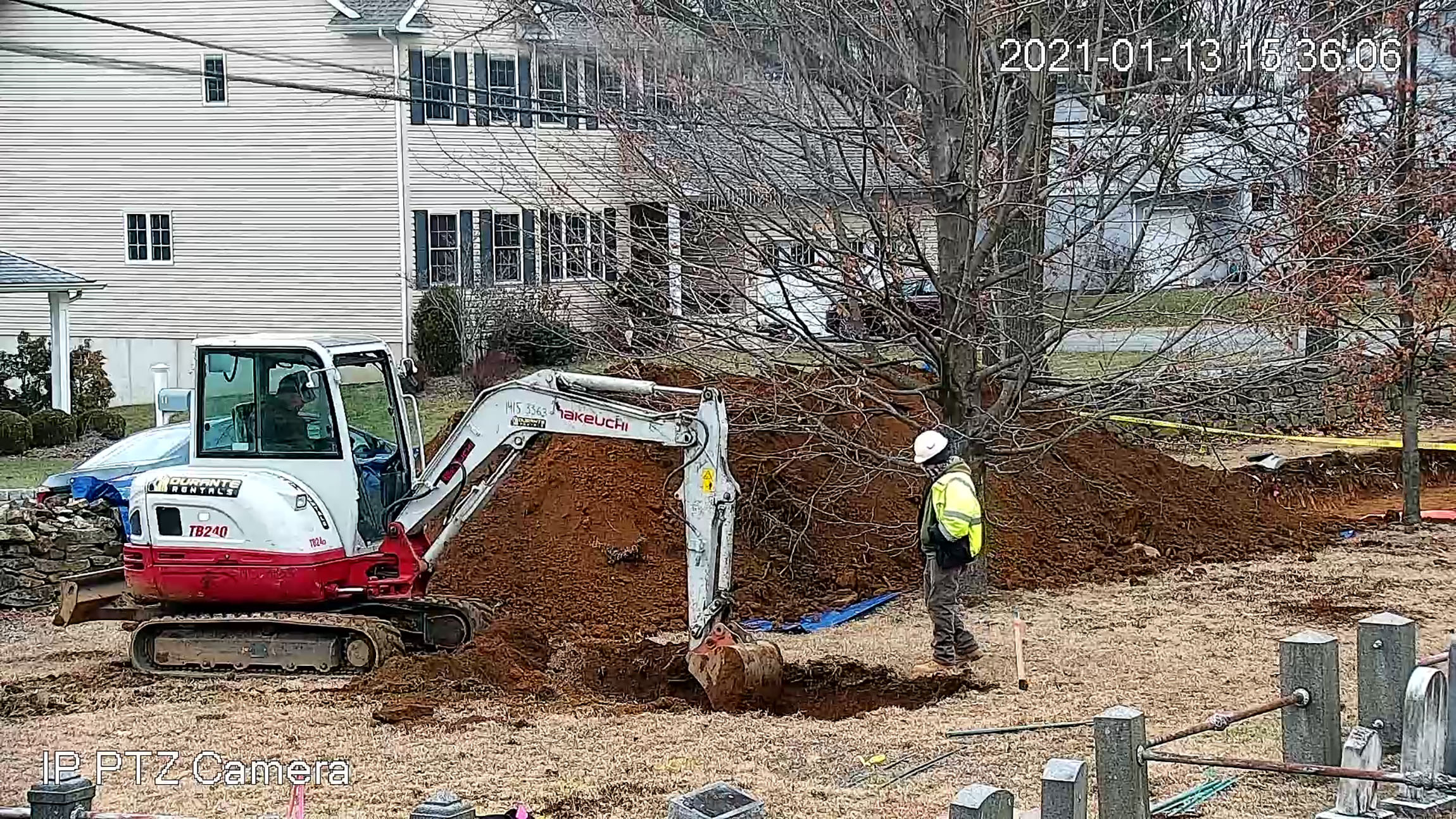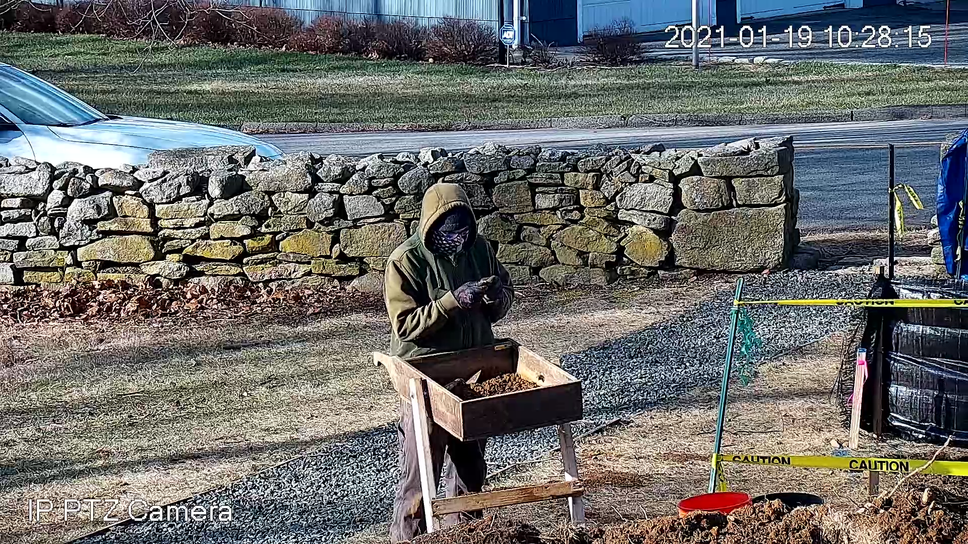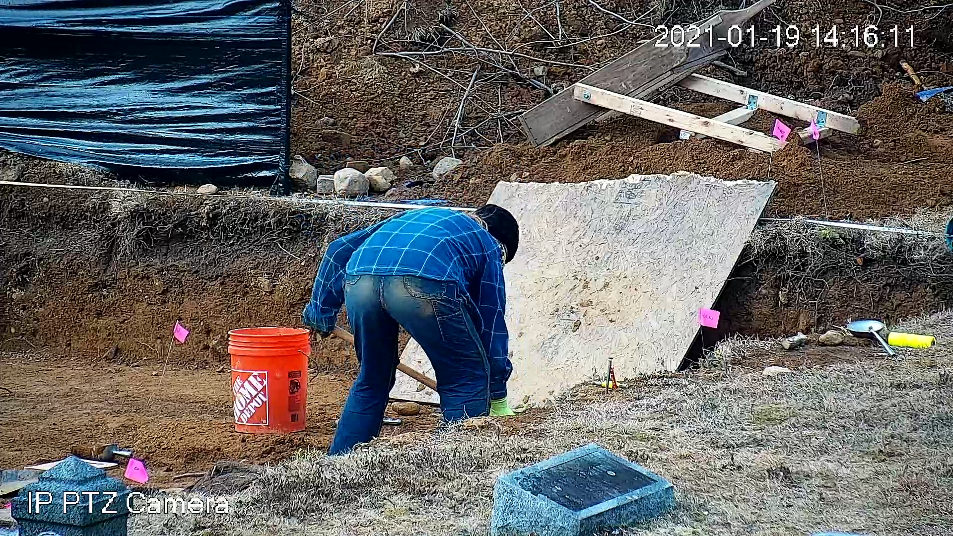 A new camera to monitor the Meeting House property was installed and connected online, allowing the work to be photographed remotely. By the end of the day, Trench #1 (T1) was opened and prepared for closer inspection.