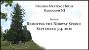 On September 3, 2020, the Norway Spruce that dominated the Cemetery skyline for decades was carefully removed by a skilled crew from Fullerton Landscaping. To avoid damaging the markers crowded around the base of the tree, the branches were removed first and then large pieces of the trunk were cut and carefully lowered by rope to the empty space behind the Meeting House. Everything was then shredded and carted away. Joe Schilip, Associate Director of the County College of Morris Alex DeCroce Media Center, and Association supporters Carla and Wayne Myer recorded the progress.